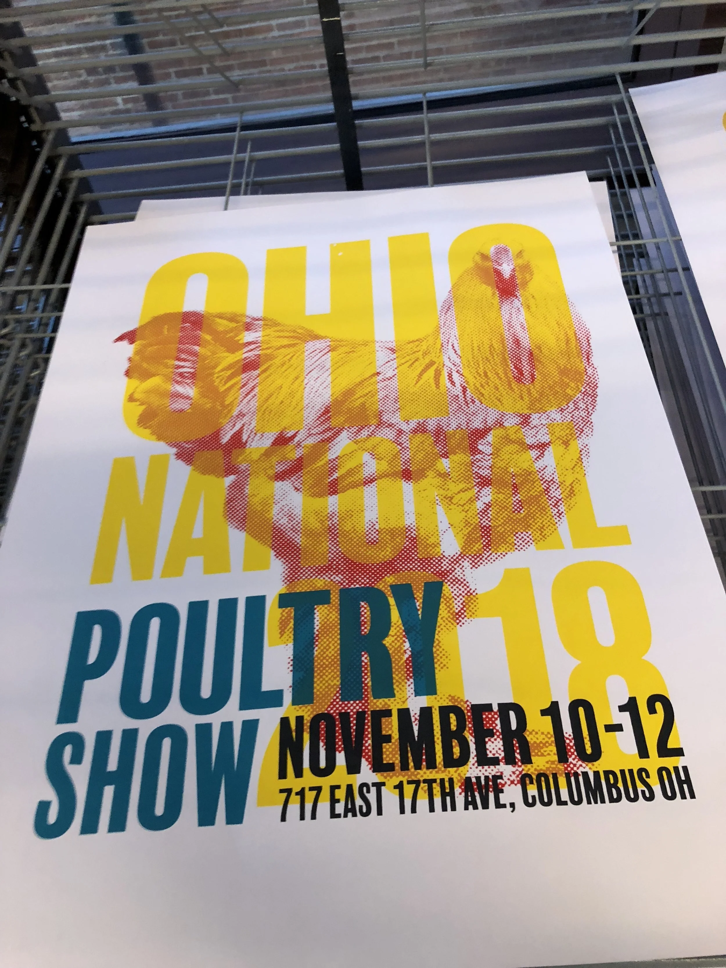 In all of my college career the proudest work I did was for my screen printing class. I found everything related to the process as cathartic; The sweet smell of the ink in the warm air, the whip and snap of the squeegee on the screen, the hours spent washing and drying, printing and reprinting. For one of my final exhibitions for the class, I was assigned the Ohio National Poultry Show. I was blown away by the research and by the lengths that participants would go to ensure that their bird was tip-top. Seriously, I encourage a deep dive into the show and its history.
